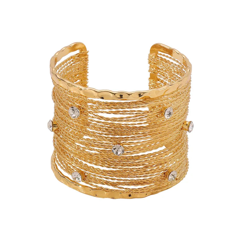 Add instant glamour to your look with this Textured Crystal Studded Wide Cuff Bracelet, designed for women who love bold, luxurious accessories. Featuring a unique layered wire-texture finish with sparkling crystal accents, this wide cuff bracelet creates a rich, statement look with modern elegance.