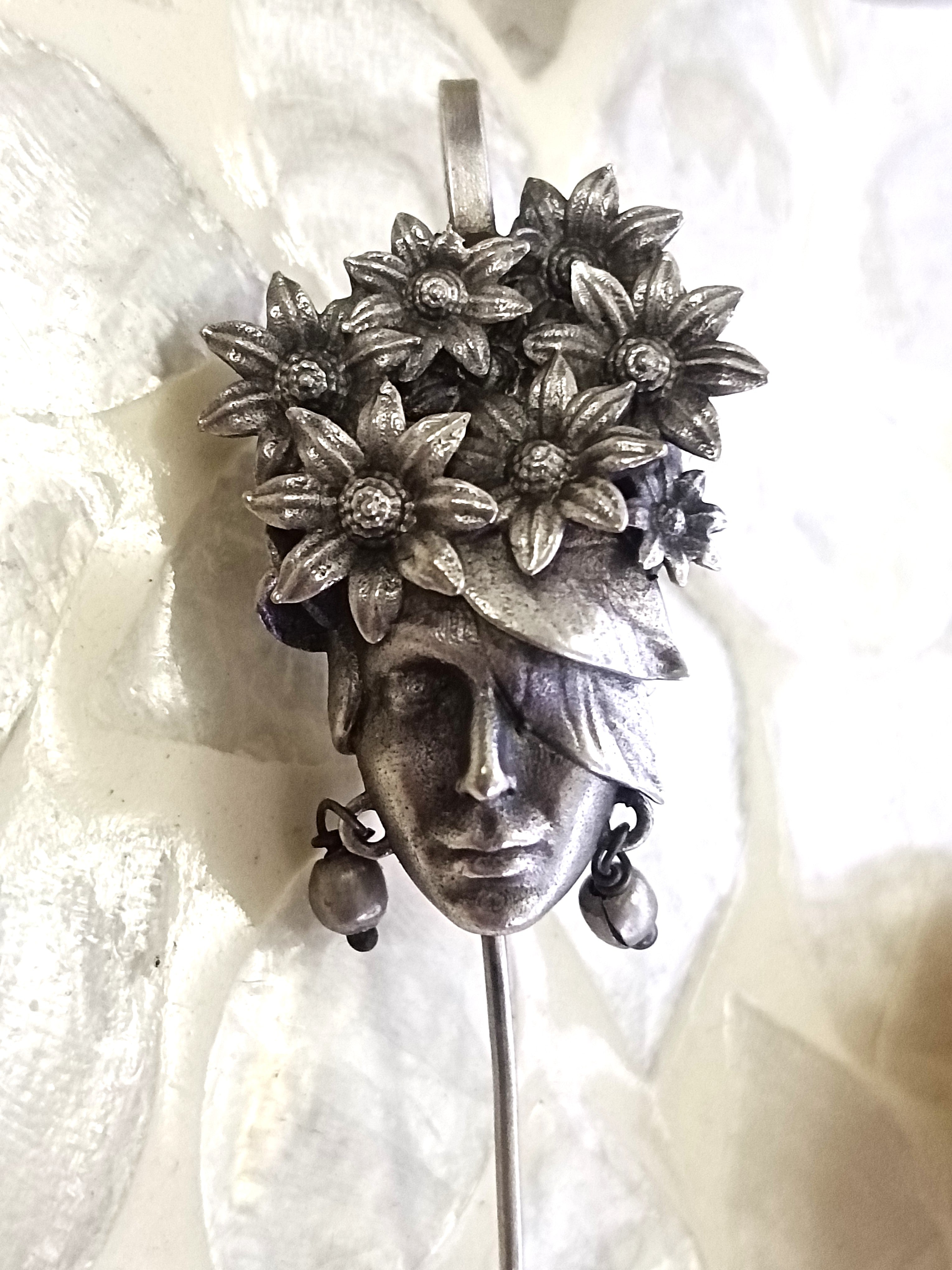 Art Nouveau earrings, oxidized silver earrings, floral face earrings, statement earrings for women, handcrafted designer jewelry, vintage-inspired earrings.