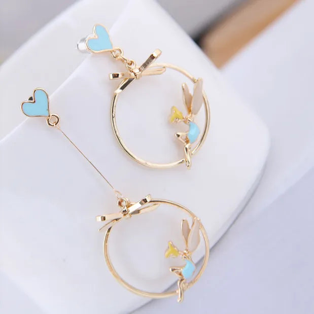Add a dreamy, elegant touch to your look with these Gold Heart & Fairy Hoop Drop Earrings from The Mirage Fashion. Designed with a charming heart-shaped stud, delicate bow-knot detailing, and a graceful fairy motif sitting inside a golden hoop, these earrings blend whimsy with sophistication.