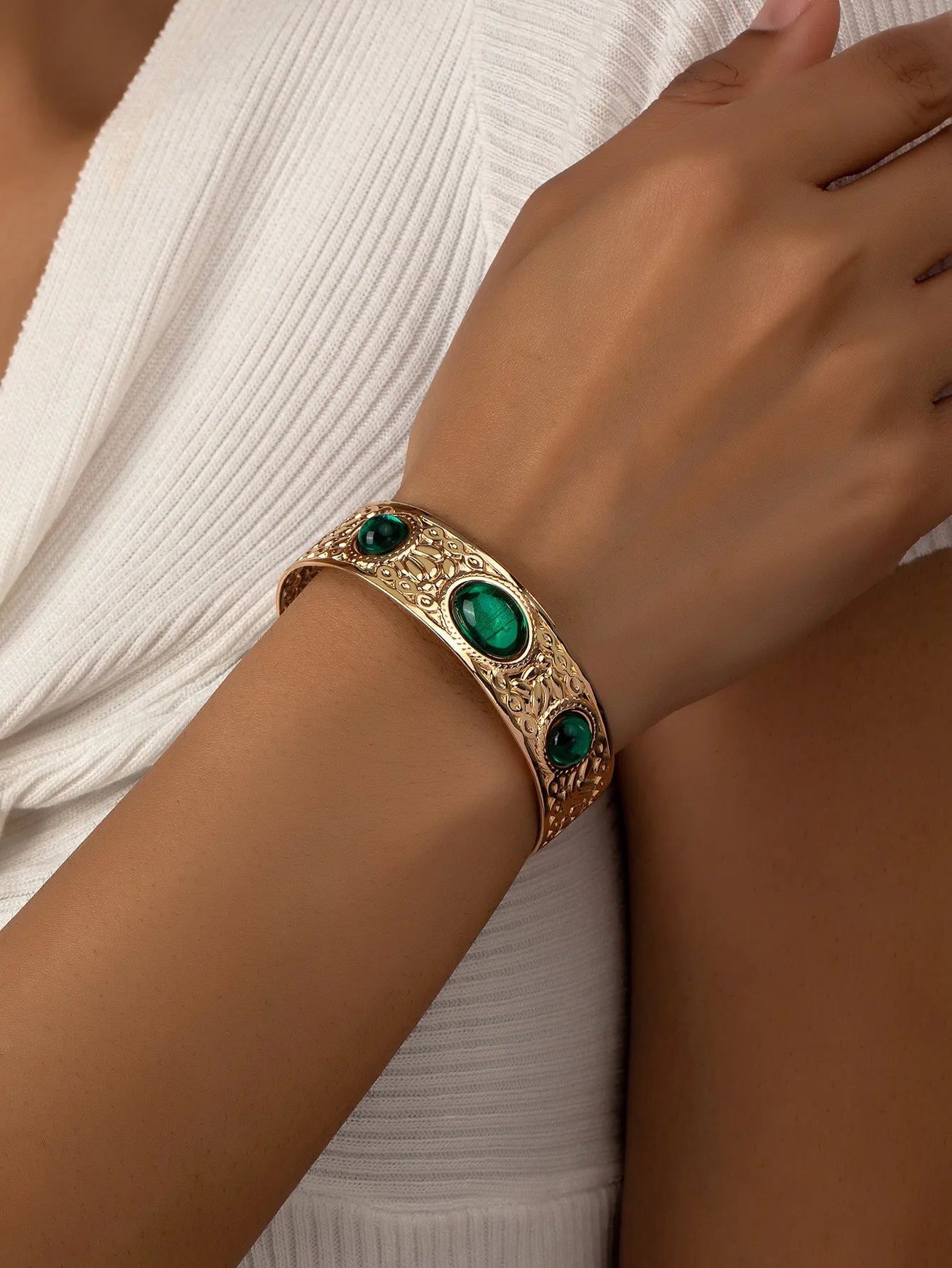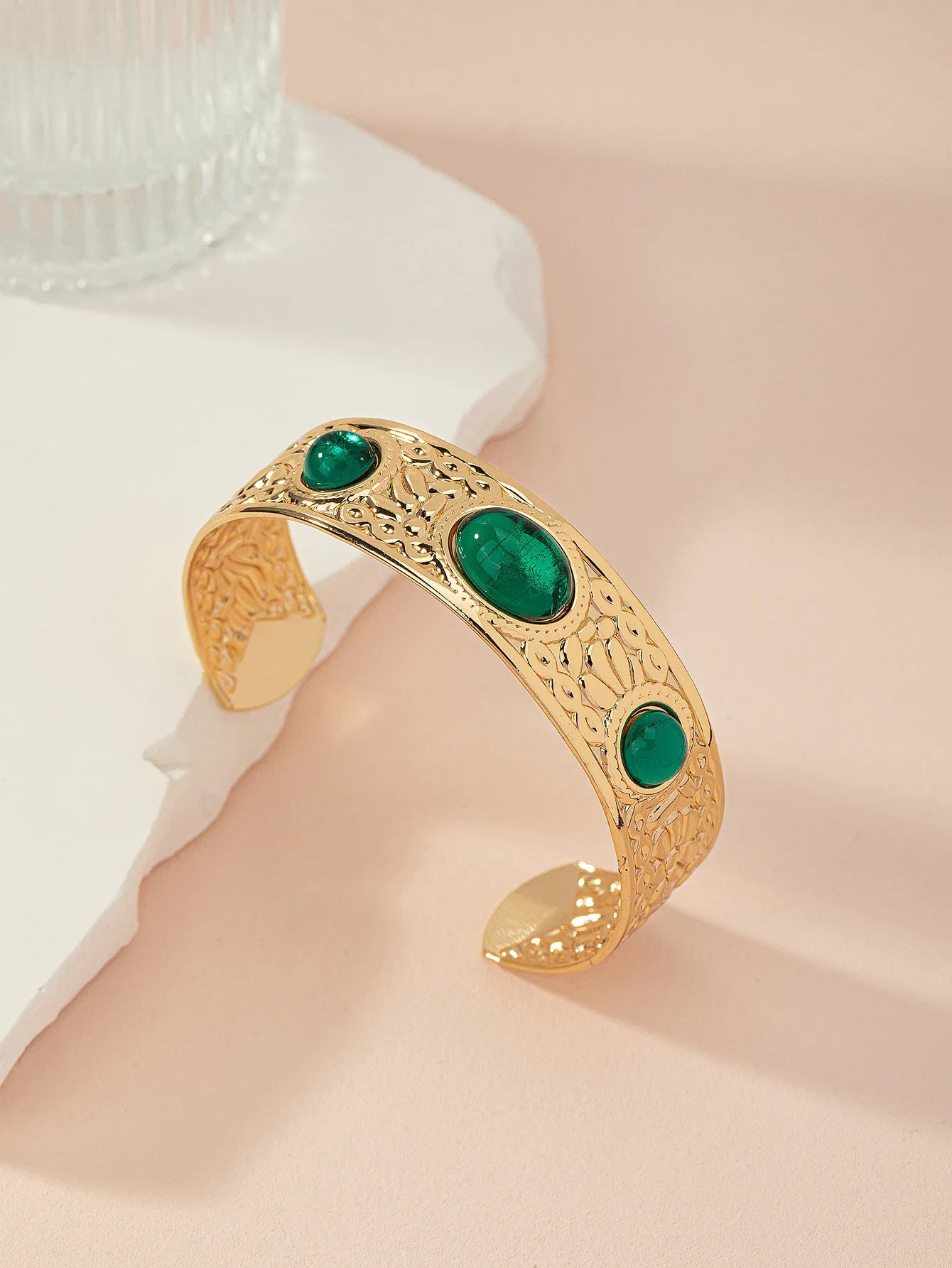 Make a royal style statement with this exquisite gold plated green stone kada, designed with intricate detailing and rich gemstone accents. Featuring deep emerald-green stones set in an antique-inspired gold finish, this open cuff bracelet adds timeless elegance to both traditional and contemporary looks.